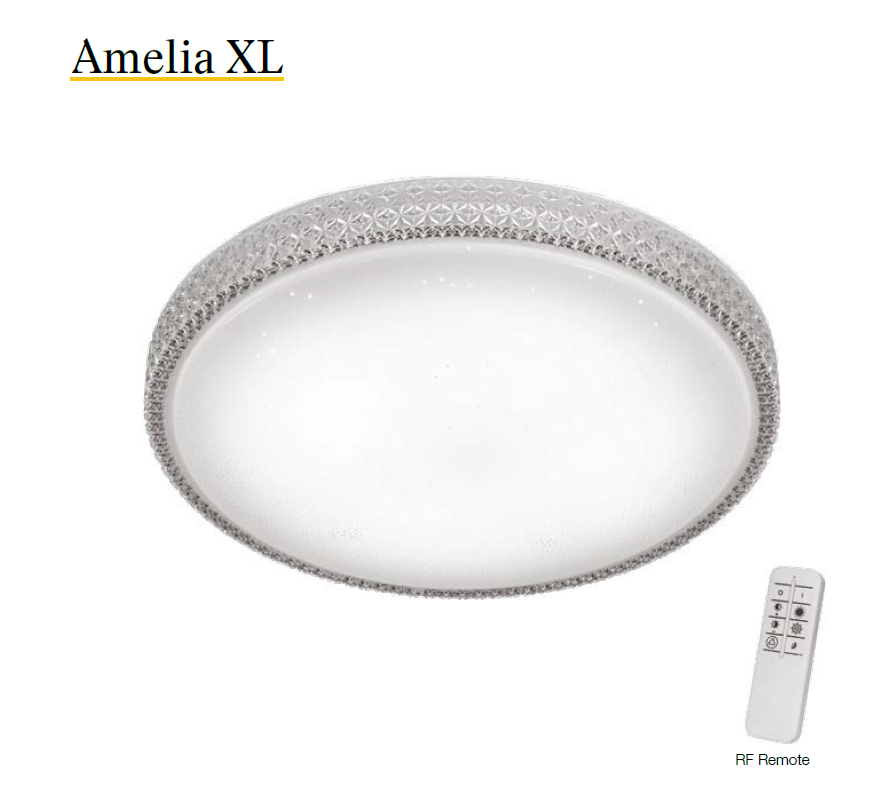 • Amelia XL LED large 50W tricolor ceiling light featuring a low profile and compact size with remote control.