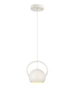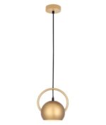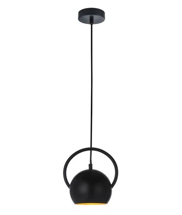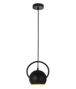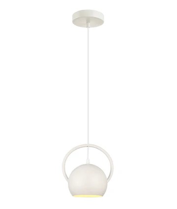 • Contemporary pendant light with a unique spherical design and a decorative ring accent.