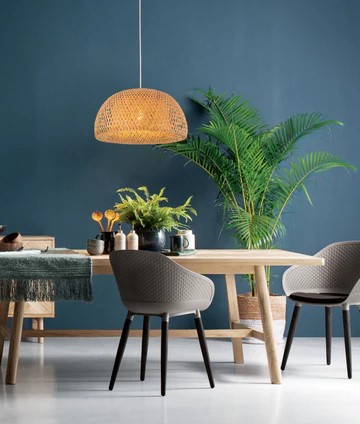 • A pendant light fixture with a woven design. The shade is dome-shaped and made from natural materials like rattan or bamboo.