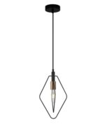• Diamond-shaped pendant light with an open black wire frame.
