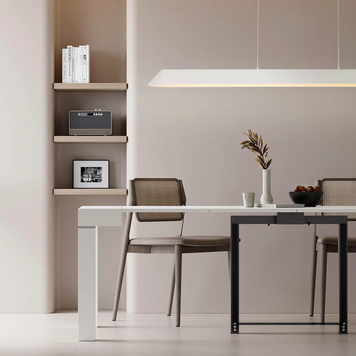 • Corsa 1470mm 3CCT Integrated LED Industrial Pendant features a sleek, contemporary design with modern, industrial, and Scandinavian influences.