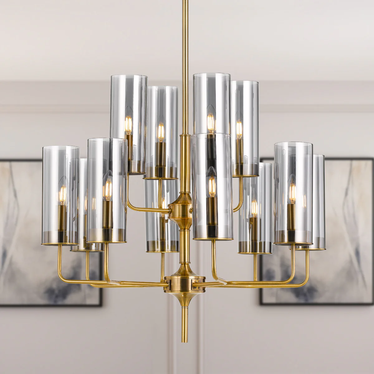 • Decaro 12 light gold frame with smoke glass pendant exudes elegance by seamlessly merging a metal frame finished in gold with 12 cylindrical glass shades.