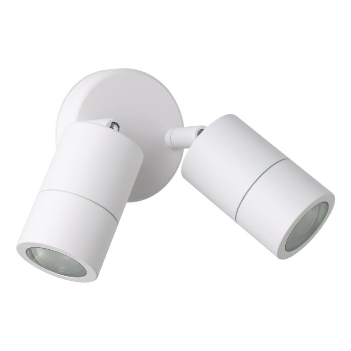 • Features two cylindrical, white-finished adjustable spotlights mounted on a simple round base, ideal for a clean and contemporary look.