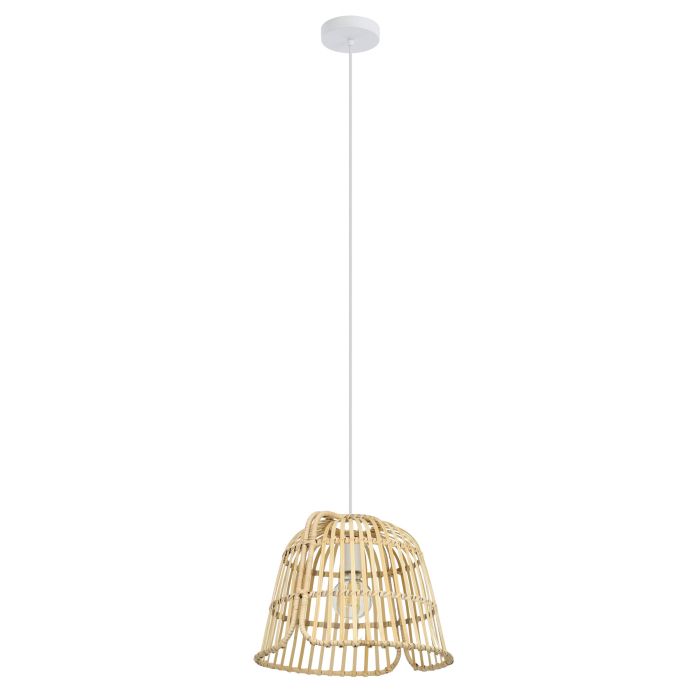• The Glyneath pendant light features a round lampshade crafted from natural rattan wicker, creating a stunning interplay of light and shadows when illuminated.