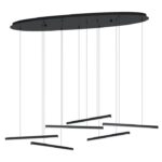 • A large, oval-shaped ceiling canopy suspends multiple slim, horizontal light bars arranged at varying heights, creating a balanced, layered appearance.