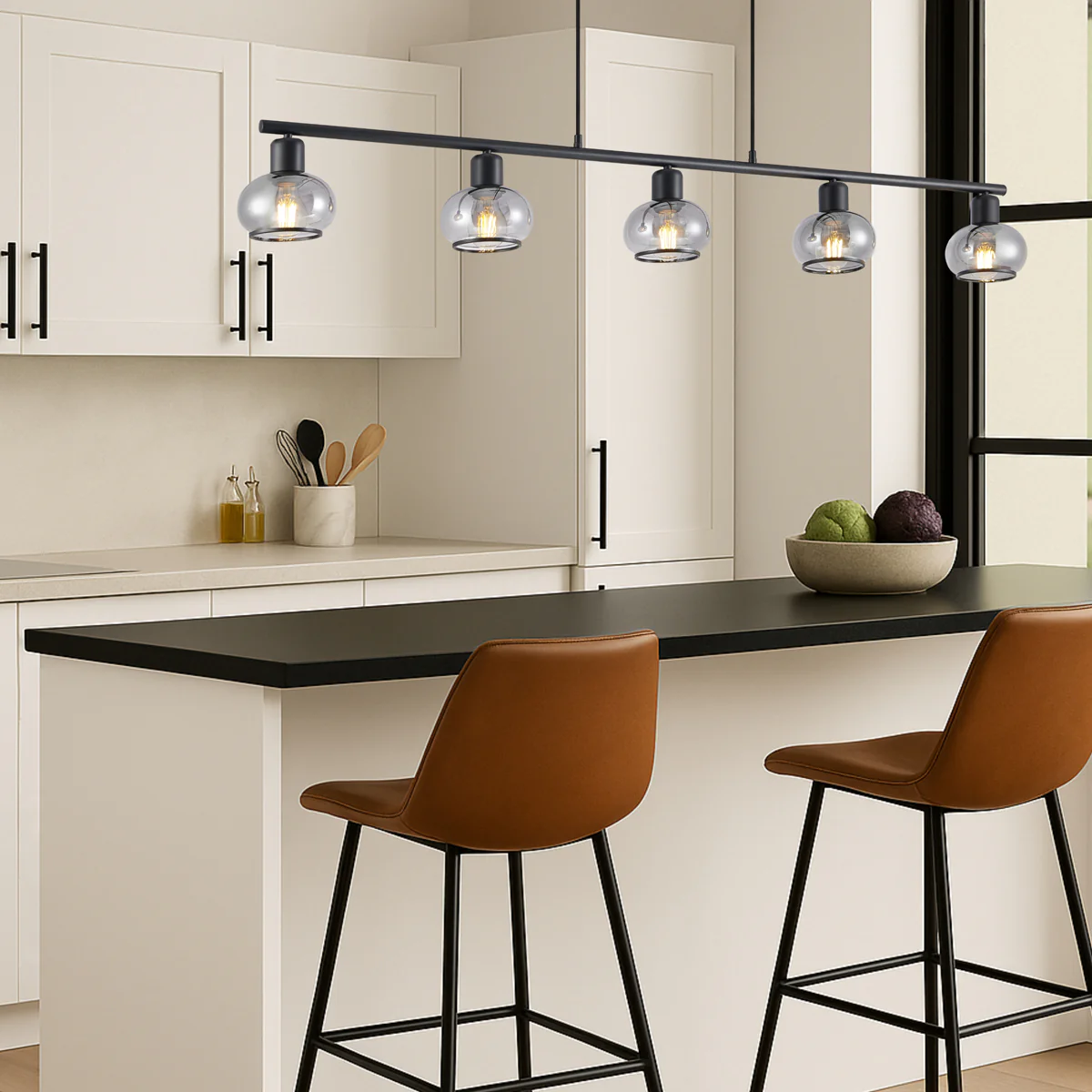 • Marbell 5 light parallel downward glass pendant features an epitomizes contemporary elegance through its meticulous construction of iron and glass.