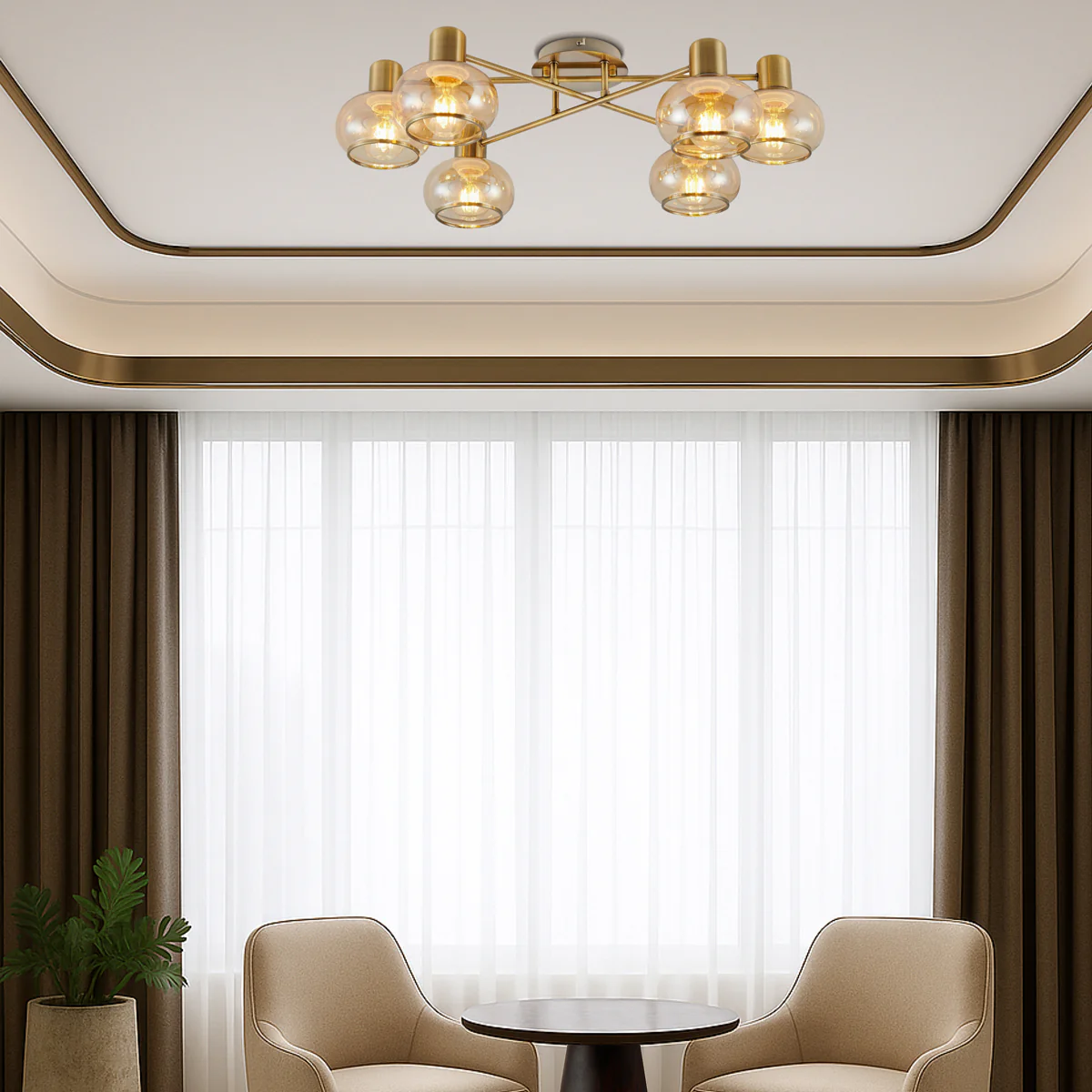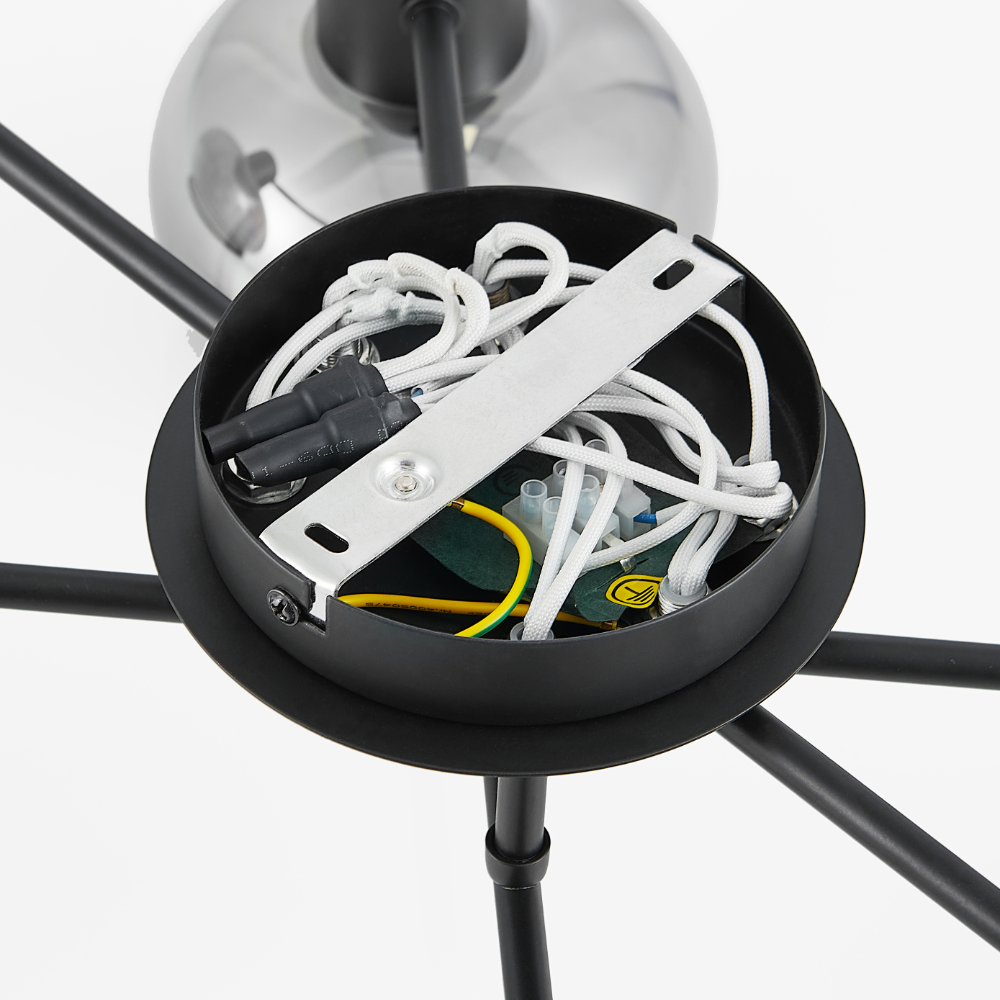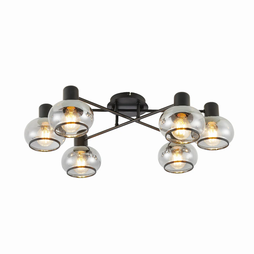 • Marbell 6 light close-to-ceiling downward glass pendant features an epitomizes contemporary elegance through its meticulous construction of iron and glass.