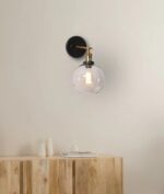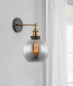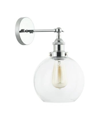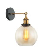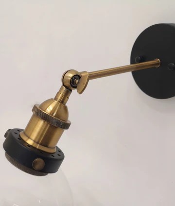 Swing arm wall light with a sleek glass shade and antique brass or chrome highlights.