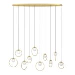 • A visually dynamic chandelier featuring a collection of hanging rings and spheres.