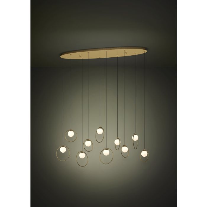 • A brushed gold base with suspended elements for a sleek, opulent aesthetic.