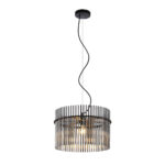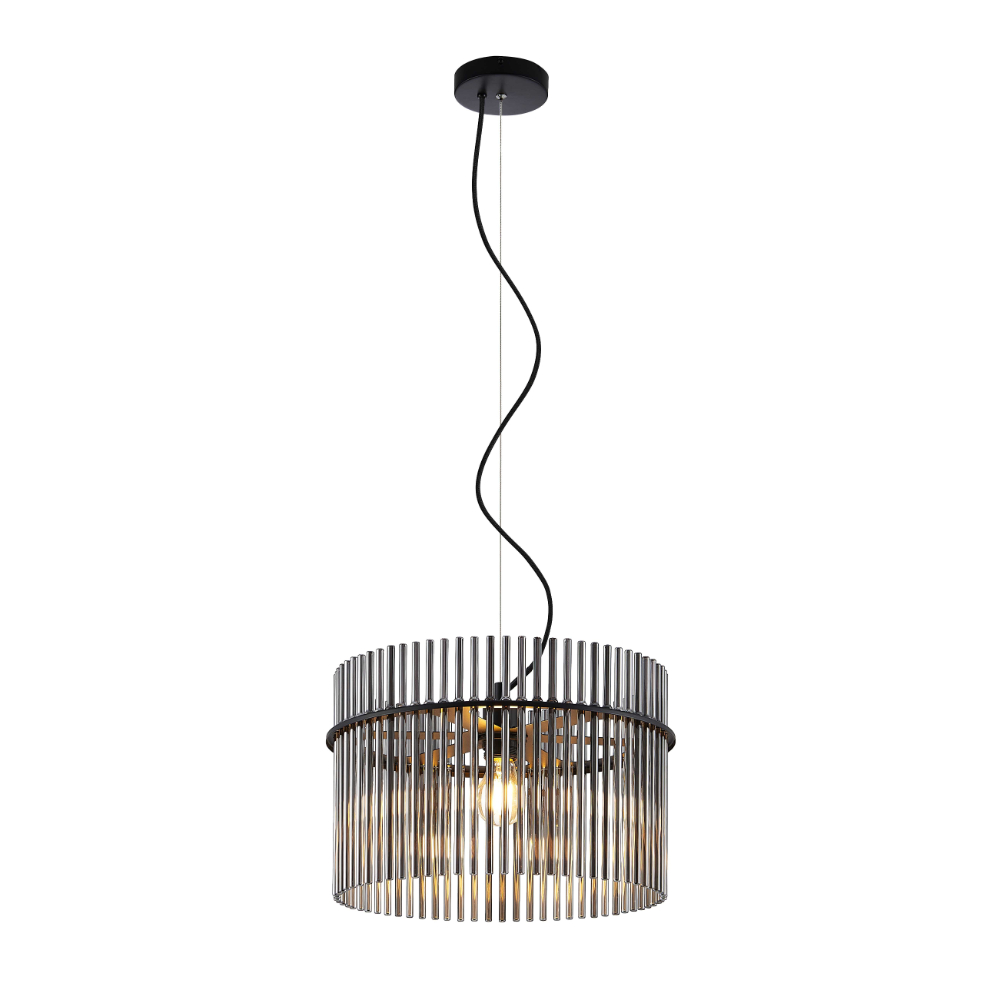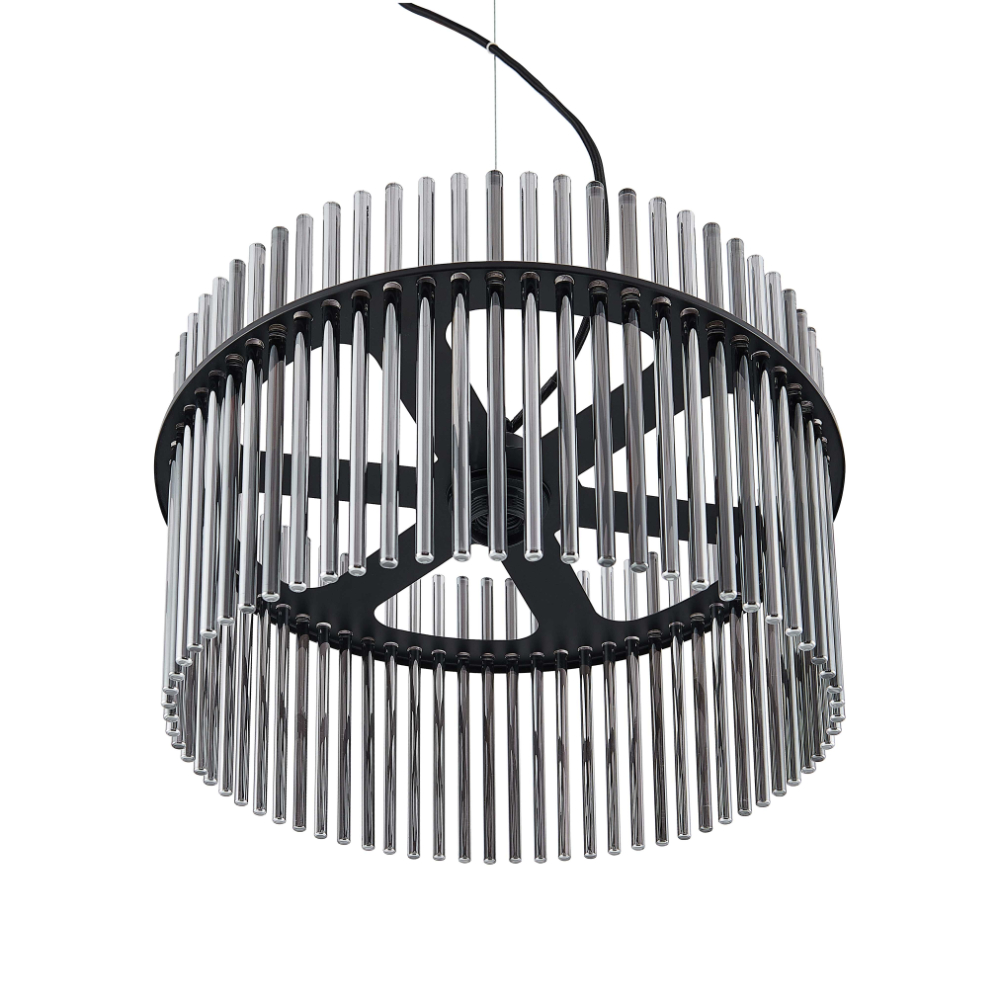• Each piece features a shade crafted from sleek glass rods in a sophisticated smoke color.