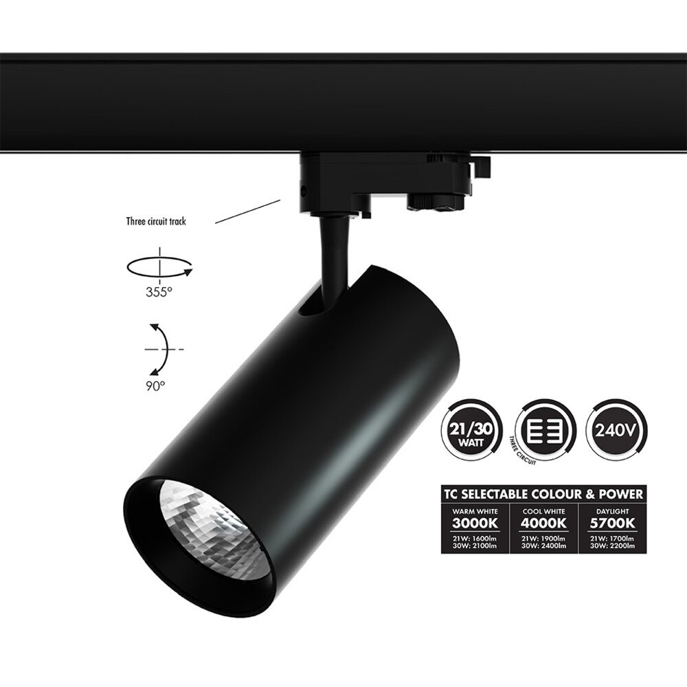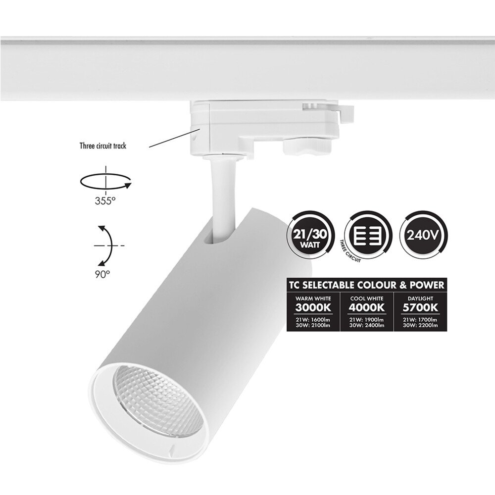 • STR3/9017 unitrek three circuit, 21/30 watt architectural track spot, with integral dual power driver and selectable colour temperature ideal solution for task lighting.
