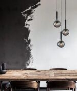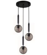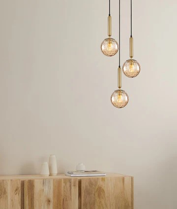 • Spherical glass pendant lights in bronze amber or smokey black, arranged on a multiple round base.